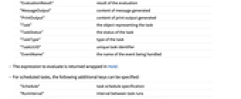 "EvaluationExpression" expression being evaluated "EvaluationResult" result of the evaluation "MessageOutput" content of message generated "PrintOutput" content of print output generated "Task" the object representing the task "TaskStatus" the status of the task "TaskType" type of the task "TaskUUID" unique task identifier "EventName" the name of the event being handled - The expression to evaluate is returned wrapped in Hold.