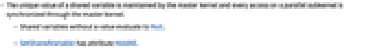 - The unique value of a shared variable is maintained by the master kernel and every access on a parallel subkernel is synchronized through the master kernel.
