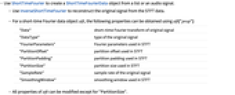 "Data" short-time Fourier transform of original signal "DataType" type of the original signal "FourierParameters" Fourier parameters used in STFT "PartitionOffset" partition offset used in STFT "PartitionPadding" partition padding used in STFT "PartitionSize" partition size used in STFT "SampleRate" sample rate of the original signal "SmoothingWindow" smoothing window used in STFT - All properties of stft can be modified except for "PartitionSize".