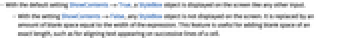 - With the setting ShowContents->False, any StyleBox object is not displayed on the screen. It is replaced by an amount of blank space equal to the width of the expression. This feature is useful for adding blank space of an exact length, such as for aligning text appearing on successive lines of a cell.