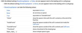- With the default setting ShowGroupOpener->None, no icon appears next to the leading cell in a cell group.