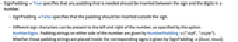 - Different sign characters can be present to the left and right of the number, as specified by the option NumberSigns. Padding strings on either side of the number are given by NumberPadding{"sleft","sright"}. Whether those padding strings are placed inside the corresponding signs is given by SignPadding{lbool,rbool}.
