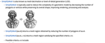 - SimplifyMesh[mesh,crit] returns a mesh region satisfying the specified criteria crit.