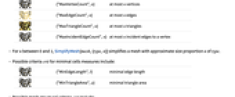{"MaxIncidentEdgeCount",n} at most n incident edges to a vertex - For n between 0 and 1, SimplifyMesh[mesh,{type,n}] simplifies a mesh with approximate size proportion n of type.