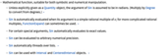 - Unless explicitly given as a Quantity object, the argument of Sin is assumed to be in radians. (Multiply by Degree to convert from degrees.) »