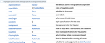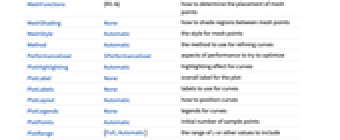 AlignmentPoint Center the default point in the graphic to align with AspectRatio 1/GoldenRatio ratio of height to width Axes True whether to draw axes AxesLabel None axes labels AxesOrigin Automatic where axes should cross AxesStyle {} style specifications for the axes Background None background color for the plot BaselinePosition Automatic how to align with a surrounding text baseline BaseStyle {} base style specifications for the graphic ClippingStyle None what to draw where curves are clipped ColorFunction Automatic how to determine the coloring of curves ColorFunctionScaling True whether to scale arguments to ColorFunction ContentSelectable Automatic whether to allow contents to be selected CoordinatesToolOptions Automatic detailed behavior of the coordinates tool Epilog {} primitives rendered after the main plot EvaluationMonitor None expression to evaluate at every function evaluation Exclusions Automatic points in x to exclude ExclusionsStyle None what to draw at excluded points Filling None filling to insert under each curve FillingStyle Automatic style to use for filling FormatType TraditionalForm the default format type for text Frame False whether to put a frame around the plot FrameLabel None frame labels FrameStyle {} style specifications for the frame FrameTicks Automatic frame ticks FrameTicksStyle {} style specifications for frame ticks GridLines None grid lines to draw GridLinesStyle {} style specifications for grid lines ImageMargins 0. the margins to leave around the graphic ImagePadding All what extra padding to allow for labels etc. ImageSize Automatic the absolute size at which to render the graphic LabelingSize Automatic maximum size of callouts and labels LabelStyle {} style specifications for labels MaxRecursion Automatic the maximum number of recursive subdivisions allowed Mesh None how many mesh points to draw on each curve MeshFunctions {#1&} how to determine the placement of mesh points MeshShading None how to shade regions between mesh points MeshStyle Automatic the style for mesh points Method Automatic the method to use for refining curves PerformanceGoal $PerformanceGoal aspects of performance to try to optimize PlotHighlighting Automatic highlighting effect for curves PlotLabel None overall label for the plot PlotLabels None labels to use for curves PlotLayout Automatic how to position curves PlotLegends None legends for curves PlotPoints Automatic initial number of sample points PlotRange {Full,Automatic} the range of y or other values to include PlotRangeClipping True whether to clip at the plot range PlotRangePadding Automatic how much to pad the range of values PlotRegion Automatic the final display region to be filled PlotStyle Automatic graphics directives to specify the style for each curve PlotTheme $PlotTheme overall theme for the plot PreserveImageOptions Automatic whether to preserve image options when displaying new versions of the same graphic Prolog {} primitives rendered before the main plot RegionFunction (True&) how to determine whether a point should be included RotateLabel True whether to rotate y labels on the frame SamplingPeriod None the sampling period ScalingFunctions {"Log10","dB"} the scaling functions TargetUnits Automatic units to display in the plot Ticks Automatic axes ticks TicksStyle {} style specifications for axes ticks Tolerance 0 the tolerance in computing the singular values WorkingPrecision MachinePrecision the precision used in internal computations