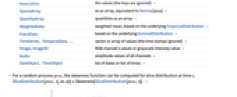 Association the values (the keys are ignored) » SparseArray as an array, equivalent to Normal[data] » QuantityArray quantities as an array » WeightedData weighted mean, based on the underlying EmpiricalDistribution » EventData based on the underlying SurvivalDistribution » TimeSeries, TemporalData, … vector or array of values (the time stamps ignored) » Image,Image3D RGB channel's values or grayscale intensity value » Audio amplitude values of all channels » DateObject, TimeObject list of dates or list of times » - For a random process proc, the skewness function can be computed for slice distribution at time t, SliceDistribution[proc,t], as α[t]=Skewness[SliceDistribution[proc,t]]. »