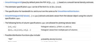 {colx,coly} histogram values {x,y} from colx and coly {{colx1,coly1},{colx2,coly2},…} histogram values from multiple pairs of columns - Possible distribution functions dfun include: