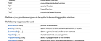 "PDF" probability density function "Intensity" count density function "CDF" cumulative distribution function "SF" survival function "HF" hazard function "CHF" cumulative hazard function - The form w[data] provides a wrapper w to be applied to the resulting graphics primitives.