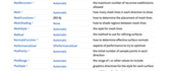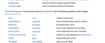 AlignmentPoint Center the default point in the graphic to align with AspectRatio Automatic ratio of height to width Axes True whether to draw axes AxesEdge Automatic on which edges to put axes AxesLabel None axes labels AxesOrigin Automatic where axes should cross AxesStyle {} graphics directives to specify the style for axes Background None background color for the plot BaselinePosition Automatic how to align with a surrounding text baseline BaseStyle {} base style specifications for the graphic BoundaryStyle Automatic how to draw boundary lines for surfaces Boxed True whether to draw the bounding box BoxRatios {1,1,0.4} bounding 3D box ratios BoxStyle {} style specifications for the box ClippingStyle Automatic how to draw clipped parts of surfaces ClipPlanes None clipping planes ClipPlanesStyle Automatic style specifications for clipping planes ColorFunction Automatic how to determine the color of surfaces ColorFunctionScaling True whether to scale arguments to ColorFunction ContentSelectable Automatic whether to allow contents to be selected ControllerLinking False when to link to external rotation controllers ControllerPath Automatic what external controllers to try to use Epilog {} 2D graphics primitives to be rendered after the main plot FaceGrids None grid lines to draw on the bounding box FaceGridsStyle {} style specifications for face grids Filling None filling under each surface FillingStyle Opacity[0.5] style to use for filling FormatType TraditionalForm default format type for text ImageMargins 0. the margins to leave around the graphic ImagePadding All what extra padding to allow for labels, etc. ImageSize Automatic absolute size at which to render the graphic LabelStyle {} style specifications for labels Lighting Automatic simulated light sources to use MaxRecursion Automatic the maximum number of recursive subdivisions allowed Mesh Automatic how many mesh lines in each direction to draw MeshFunctions {#3&} how to determine the placement of mesh lines MeshShading None how to shade regions between mesh lines MeshStyle Automatic the style for mesh lines Method Automatic the method to use for refining surfaces NormalsFunction Automatic how to determine effective surface normals PerformanceGoal $PerformanceGoal aspects of performance to try to optimize PlotLabel None a label for the plot PlotPoints Automatic the initial number of sample points in each direction PlotRange Automatic the range of z or other values to include PlotRangePadding Automatic how much to pad the range of values PlotRegion Automatic final display region to be filled PlotStyle Automatic graphics directives for the style for each surface PlotTheme $PlotTheme overall theme for the plot PreserveImageOptions Automatic whether to preserve image options when displaying new versions of the same graphic Prolog {} 2D graphics primitives to be rendered before the main plot RegionFunction (True&) how to determine whether a point should be included RotationAction "Fit" how to render after interactive rotation ScalingFunctions None how to scale individual coordinates SphericalRegion Automatic whether to make the circumscribing sphere fit in the final display area Ticks Automatic specification for ticks TicksStyle {} style specification for ticks TouchscreenAutoZoom False whether to zoom to fullscreen when activated on a touchscreen ViewAngle Automatic angle of the field of view ViewCenter Automatic point to display at the center ViewMatrix Automatic explicit transformation matrix ViewPoint {1.3,-2.4,2.} viewing position ViewProjection Automatic projection method for rendering objects distant from the viewer ViewRange All range of viewing distances to include ViewVector Automatic position and direction of a simulated camera ViewVertical {0,0,1} direction to make vertical WorkingPrecision MachinePrecision the precision used in internal computations