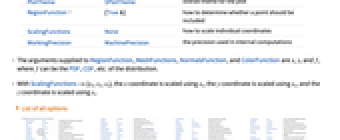 Axes True whether to draw axes BoundaryStyle Automatic how to draw boundary lines for surfaces BoxRatios {1,1,0.4} bounding 3D box ratios ClippingStyle Automatic how to draw clipped parts of surfaces ColorFunction Automatic how to determine the color of surfaces ColorFunctionScaling True whether to scale arguments to ColorFunction Filling None filling under each surface FillingStyle Opacity[0.5] style to use for filling MaxRecursion Automatic the maximum number of recursive subdivisions allowed Mesh Automatic how many mesh lines in each direction to draw MeshFunctions {#3&} how to determine the placement of mesh lines MeshShading None how to shade regions between mesh lines MeshStyle Automatic the style for mesh lines Method Automatic the method to use for refining surfaces NormalsFunction Automatic how to determine effective surface normals PerformanceGoal $PerformanceGoal aspects of performance to try to optimize PlotPoints Automatic the initial number of sample points in each direction PlotRange Automatic the range of z or other values to include PlotStyle Automatic graphics directives for the style for each surface PlotTheme $PlotTheme overall theme for the plot RegionFunction (True&) how to determine whether a point should be included ScalingFunctions None how to scale individual coordinates WorkingPrecision MachinePrecision the precision used in internal computations - The arguments supplied to RegionFunction, MeshFunctions, NormalsFunction, and ColorFunction are x, y, and f, where f can be the PDF, CDF, etc. of the distribution.