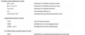 {host,port} hostname or IP address and port number {host,"service"} hostname or IP address and service name "host:port" hostname or IP address with port port local socket localhost:port URL["url"] or "url" complete URL (e.g. http://www.wolfram.com) - Supported protocols include: