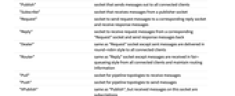 "Pair" socket that can send/receive with exactly one client peer "Publish" socket that sends messages out to all connected clients "Subscribe" socket that receives messages from a publisher socket "Request" socket to send request messages to a corresponding reply socket and receive response messages "Reply" socket to receive request messages from a corresponding "Request" socket and send response messages back "Dealer" same as "Request" socket except sent messages are delivered in round-robin style to all connected clients "Router" same as "Reply" socket except messages are received in fair-queueing style from all connected clients and maintain routing information "Pull" socket for pipeline topologies to receive messages "Push" socket for pipeline topologies to send messages "XPublish" same as "Publish", but received messages on this socket are subscriptions "XSubscribe" same as "Subscribe", but messages sent over this socket are used as subscriptions to the corresponding "XPublish" socket "Stream" socket for connecting a ZMQ socket to non-ZMQ TCP sockets - With no ZMQ protocol type specified, the underlying socket is a "Pair" socket.