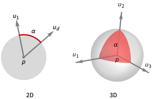 - SolidAngle[p,{u1,…,ud}] is the measure of the intersection of the d-dimensional unit sphere Sphere[p] and the conic hull generated by the vectors u1,…,ud.