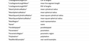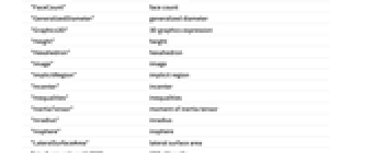 "AlternateNames" alternate names "AssociatedPeople" associated people "Boundary" boundary "BoundaryMeshRegion" boundary mesh representation "BoundarySurface" boundary surface "BoundingBox" corners of bounding box "Centroid" centroid "Circumcenter" circumcenter "Circumdiameter" circumdiameter "Circumradius" circumradius "Circumsphere" circumsphere "Classes" classes "Concave" concave "ConstantWidth" constant width "Convex" convex "ConvexityCoefficient" convexity coefficient "CrossSections" cross sections "FaceCount" face count "GeneralizedDiameter" generalized diameter "Graphics3D" 3D graphics expression "Height" height "Hexahedron" hexahedron "Image" image "ImplicitRegion" implicit region "Incenter" incenter "Inequalities" inequalities "InertiaTensor" moment of inertia tensor "Inradius" inradius "Insphere" insphere "LateralSurfaceArea" lateral surface area "LineSegmentLengthCDF" CDF of lengths "LineSegmentLengthMean" mean line segment length "LineSegmentLengthPDF" PDF of lengths "MeanCylindricalRadius" mean cylindrical radius "MeanSphericalRadius" mean spherical radius "MeanSquareCylindricalRadius" mean square cylindrical radius "MeanSquareSphericalRadius" mean square spherical radius "MeshRegion" mesh representation "Name" name "Parallelepiped" parallelepiped "Parameters" parameters "ParametricRegion" parametric region "Polyhedron" polyhedron "RealWorldExamples" real-world examples "Region" region "RegularPolyhedron" regular polyhedron "RelatedWolframLanguageSymbols" related symbols in the Wolfram Language "SlantHeight" slant height "SolidOfRevolution" solid of revolution "SportObjects" sport objects of given shape "SurfaceArea" surface area "TetrahedronVolumeMean" mean volume of randomly picked tetrahedron "TriangleAreaCDF" CDF of randomly picked triangle area "TriangleAreaMean" mean area of randomly picked triangle "TriangleAreaPDF" PDF of randomly picked triangle area "VariableConstraints" variable constraints "VariableDescriptions" description of variables "Variables" variables "VertexCount" vertex count "Vertices" vertices "Volume" volume