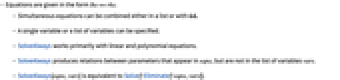 - SolveAlways produces relations between parameters that appear in eqns, but are not in the list of variables vars.
