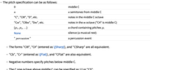 0 middle C n n semitones from middle C "C", "C#", "D", etc. notes in the middle C octave "Cm", "C#m", "Dm", etc. notes in the m octave ("C4" is middle C) {p1,p2,…} a chord containing pitches pi None silence (a musical rest) "percussion" a percussion event - The forms "C#", "C♯" (entered as \[Sharp]), and "CSharp" are all equivalent.