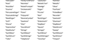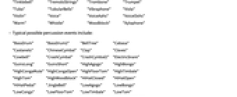 "Accordion" "Agogo" "AltoSax" "Applause" "Atmosphere" "Bagpipe" "Bandoneon" "Banjo" "BaritoneSax" "Bass" "BassAndLead" "Bassoon" "Bird" "BlownBottle" "Bowed" "BrassSection" "Breath" "Brightness" "BrightPiano" "Calliope" "Celesta" "Cello" "Charang" "Chiff" "Choir" "Clarinet" "Clavi" "Contrabass" "Crystal" "DrawbarOrgan" "Dulcimer" "Echoes" "ElectricBass" "ElectricGrandPiano" "ElectricGuitar" "ElectricPiano" "ElectricPiano2" "EnglishHorn" "Fiddle" "Fifths" "Flute" "FrenchHorn" "FretlessBass" "FretNoise" "Glockenspiel" "Goblins" "Guitar" "GuitarDistorted" "GuitarHarmonics" "GuitarMuted" "GuitarOverdriven" "Gunshot" "Halo" "Harmonica" "Harp" "Harpsichord" "Helicopter" "HonkyTonkPiano" "JazzGuitar" "Kalimba" "Koto" "Marimba" "MelodicTom" "Metallic" "MusicBox" "MutedTrumpet" "NewAge" "Oboe" "Ocarina" "OrchestraHit" "Organ" "PanFlute" "PercussiveOrgan" "Piano" "Piccolo" "PickedBass" "PizzicatoStrings" "Polysynth" "Rain" "Recorder" "ReedOrgan" "ReverseCymbal" "RockOrgan" "Sawtooth" "SciFi" "Seashore" "Shakuhachi" "Shamisen" "Shanai" "Sitar" "SlapBass" "SlapBass2" "SopranoSax" "Soundtrack" "Square" "Steeldrums" "SteelGuitar" "Strings" "Strings2" "Sweep" "SynthBass" "SynthBass2" "SynthBrass" "SynthBrass2" "SynthDrum" "SynthStrings" "SynthStrings2" "SynthVoice" "Taiko" "Telephone" "TenorSax" "Timpani" "Tinklebell" "TremoloStrings" "Trombone" "Trumpet" "Tuba" "TubularBells" "Vibraphone" "Viola" "Violin" "Voice" "VoiceAahs" "VoiceOohs" "Warm" "Whistle" "Woodblock" "Xylophone" - Typical possible percussion events include: