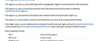 "Bins" a list of binning regions "BinCount" number of bins "BinMeasures" measures of the binning regions "Dimension" dimensionality of the binning regions "Values" values for each binning region "ConfigurationCount" number of binned observations over the same binning "ObservationRegion" global observation region - SpatialBinnedPointData can be used in functions such as PointProcessFitTest and SpatialRandomnessTest.