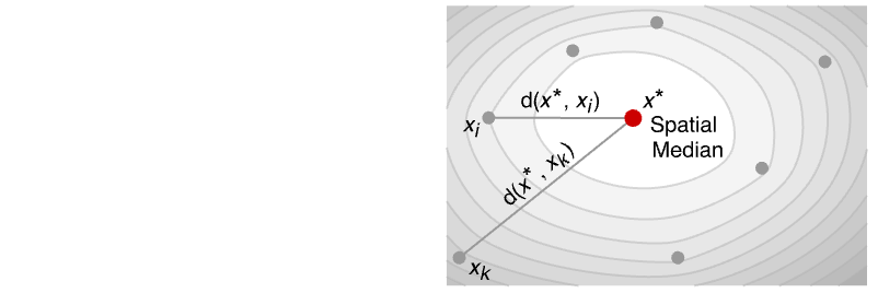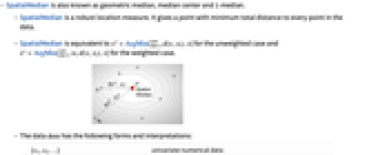 - SpatialMedian is a robust location measure. It gives a point with minimum total distance to every point in the data.