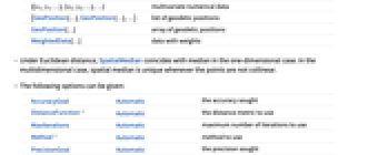 {x1,x2,…} univariate numerical data {{x1,y1,…},{x2,y2,…},…} multivariate numerical data {GeoPosition[…],GeoPosition[…],…} list of geodetic positions GeoPosition[…] array of geodetic positions WeightedData[…] data with weights - Under Euclidean distance, SpatialMedian coincides with median in the one-dimensional case. In the multidimensional case, spatial median is unique whenever the points are not collinear.