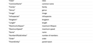 "AlternateCommonNames" alternate common names "AlternateScientificNames" alternate scientific names "BodyTemperature" body temperature "Class" class "CommonName" common name "Family" family "Genus" genus "Image" image "Infraspecies" infraspecies "Kingdom" kingdom "Length" length "MaximumLifespan" maximum lifespan "MaximumSpeed" maximum speed "Name" name "NumberOfSubEntities" number of members "Order" order "ParentEntity" parent taxon "Phylum" phylum "ScientificName" scientific name "Siblings" sibling taxa "Species" species "SpeciesAuthority" reference "SubEntities" child taxa "Taxonomy" taxonomy "TaxonomyGraph" taxonomy graph "Weight" weight