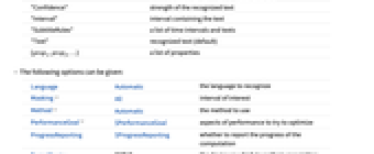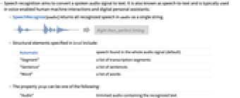 "Audio" trimmed audio containing the recognized text "Confidence" strength of the recognized text "Interval" interval containing the text "SubtitleRules" a list of time intervals and texts "Text" recognized text (default) {prop1,prop2,…} a list of properties - The following options can be given: