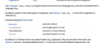 Language Automatic the language to recognize Masking All interval of interest Method Automatic the method to use PerformanceGoal $PerformanceGoal aspects of performance to try to optimize ProgressReporting $ProgressReporting whether to report the progress of the computation TargetDevice "CPU" the device on which to perform recognition - Use Languagelang1lang2 to recognize speech assumed to be in language lang1 and return translated text in language lang2.