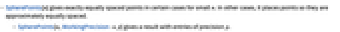 - SpherePoints[n] gives exactly equally spaced points in certain cases for small n. In other cases, it places points so they are approximately equally spaced.