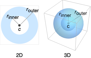 represents a filled spherical shell centered at c with inner radius rinner and outer radius router.