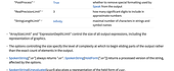 "ArraySizeLimit" Infinity maximal number of elements of an array or arguments of a function "DetailedGraphics" False controls the description of graphics primitives "ExpressionDepthLimit" Infinity maximal depth of an expression allowed in the output "IncludeParentheses" False controls the delimiting of subexpressions "IntegerLimit" Infinity maximal integer that will be given with all its digits "PostProcess" True whether to remove special formatting used by Speak from the output "RealPrecisionLimit" 3 how many significant digits to include in approximate numbers "StringLengthLimit" Infinity maximal number of characters in strings and symbol names - "ArraySizeLimit" and "ExpressionDepthLimit" control the size of all output expressions, including the representation of graphics.