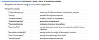 "CollisionFrequency" frequency of collisions between atmospheric particles "Density" standard density of atmosphere "DynamicViscosity" dynamic viscosity of atmosphere "GravityAcceleration" acceleration due to gravity "KinematicViscosity" kinematic viscosity of atmosphere "MeanFreePath" average distance traveled by an atmospheric particle between collisions "MeanMolecularWeight" average molecular weight of atmospheric particles "MeanParticleSpeed" average atmospheric particle speed "NumberDensity" density of atmospheric particles "Pressure" average pressure of atmosphere "PressureScaleHeight" distance over which pressure decreased by a factor of E "SoundSpeed" speed of sound "Temperature" standard temperature of atmosphere "ThermalConductivityCoefficient" thermal conductivity coefficient - StandardAtmosphereData["Layers"] gives a list of all atmospheric layers available.