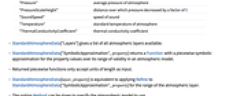 - StandardAtmosphereData[layer,property] is equivalent to applying Refine to StandardAtmosphereData["SymbolicApproximation",property] for the range of the atmospheric layer.