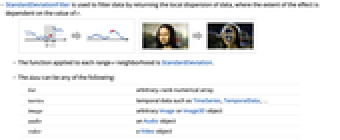 list arbitrary-rank numerical array tseries temporal data such as TimeSeries, TemporalData, … image arbitrary Image or Image3D object audio an Audio object video a Video object - For multichannel images and audio signals, StandardDeviationFilter operates separately on each channel.