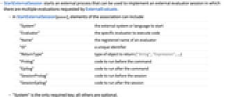 "System" the external system or language to start "Evaluator" the specific evaluator to execute code "Name" the registered name of an evaluator "ID" a unique identifier "ReturnType" type of object to return ("String", "Expression", ...) "Prolog" code to run before the command "Epilog" code to run after the command "SessionProlog" code to run before the session "SessionEpilog" code to run after the session - "System" is the only required key; all others are optional.