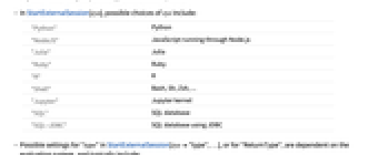 "Python" Python "NodeJS" JavaScript running through Node.js "Julia" Julia "Ruby" Ruby "R" R "Shell" Bash, Sh, Zsh, ... "Jupyter" Jupyter kernel "SQL" SQL database "SQL-JDBC" SQL database using JDBC - Possible settings for "type" in StartExternalSession[sys"type",…], or for "ReturnType", are dependent on the evaluation system, and typically include: