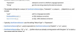 "path" path to a language executable DatabaseReference[…] an SQL database connection SQLConnection[…] an SQL-JDBC database connection - Typically, StartExternalSession uses the setting "ReturnType""Expression".