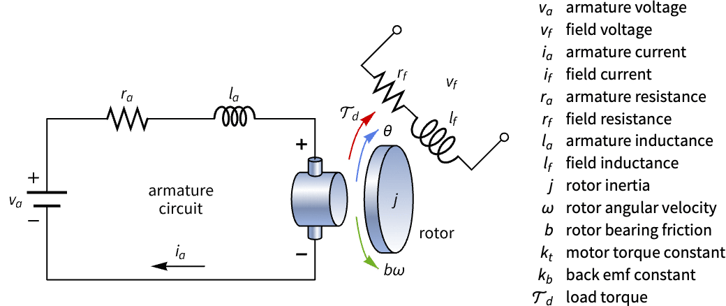 Construct a state-space model of a DC motor with armature and field voltage inputs and analyze its controllability: