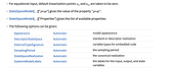 Appearance Automatic model appearance DescriptorStateSpace Automatic standard or descriptor realization ExternalTypeSignature Automatic variable types for embedded code SamplingPeriod Automatic the sampling period StateSpaceRealization Automatic the canonical realization SystemsModelLabels Automatic the labels for the input, output, and state variables - The option Appearance can take values Automatic, "Detailed", "Structured", "Elided", and "Iconized".