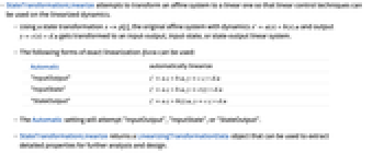 - StateTransformationLinearize returns a LinearizingTransformationData object that can be used to extract detailed properties for further analysis and design.