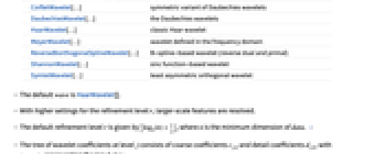 BattleLemarieWavelet[…] Battle–Lemarié wavelets based on B-spline BiorthogonalSplineWavelet[…] B-spline-based wavelet CoifletWavelet[…] symmetric variant of Daubechies wavelets DaubechiesWavelet[…] the Daubechies wavelets HaarWavelet[…] classic Haar wavelet MeyerWavelet[…] wavelet defined in the frequency domain ReverseBiorthogonalSplineWavelet[…] B-spline-based wavelet (reverse dual and primal) ShannonWavelet[…] sinc function-based wavelet SymletWavelet[…] least asymmetric orthogonal wavelet - The default wave is HaarWavelet[].