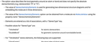 - The value of StereochemistryElements is used for generating two-dimensional structure diagrams and for embedding the molecule in three dimensions.
