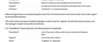 "ChiralCenter" the atom index of chiral center "FiducialAtom" index of a reference atom bonded to the chiral center "Ligands" an index list of three remaining atoms bonded to the chiral center "Direction" "Clockwise" or "Counterclockwise" - When the ligand atoms are viewed along the vector from the fiducial atom to the chiral center, their order is given by the specified direction.
