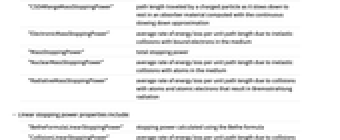 "BetheFormulaMassStoppingPower" stopping power calculated using the Bethe formula "CollisionMassStoppingPower" average rate of energy loss per unit path length due to collisions that result in the ionization and excitation of atoms "CSDARangeMassStoppingPower" path length traveled by a charged particle as it slows down to rest in an absorber material computed with the continuous slowing down approximation "ElectronicMassStoppingPower" average rate of energy loss per unit path length due to inelastic collisions with bound electrons in the medium "MassStoppingPower" total stopping power "NuclearMassStoppingPower" average rate of energy loss per unit path length due to inelastic collisions with atoms in the medium "RadiativeMassStoppingPower" average rate of energy loss per unit path length due to collisions with atoms and atomic electrons that result in Bremsstrahlung radiation - Linear stopping power properties include: