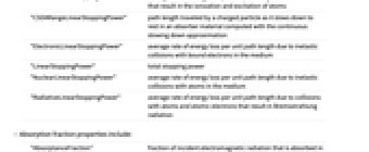 "BetheFormulaLinearStoppingPower" stopping power calculated using the Bethe formula "CollisionLinearStoppingPower" average rate of energy loss per unit path length due to collisions that result in the ionization and excitation of atoms "CSDARangeLinearStoppingPower" path length traveled by a charged particle as it slows down to rest in an absorber material computed with the continuous slowing down approximation "ElectronicLinearStoppingPower" average rate of energy loss per unit path length due to inelastic collisions with bound electrons in the medium "LinearStoppingPower" total stopping power "NuclearLinearStoppingPower" average rate of energy loss per unit path length due to inelastic collisions with atoms in the medium "RadiativeLinearStoppingPower" average rate of energy loss per unit path length due to collisions with atoms and atomic electrons that result in Bremsstrahlung radiation - Absorption fraction properties include: