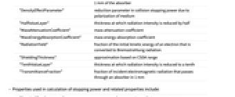 "AbsorptanceFraction" fraction of incident electromagnetic radiation that is absorbed in 1 mm of the absorber "DensityEffectParameter" reduction parameter in collision stopping power due to polarization of medium "HalfValueLayer" thickness at which radiation intensity is reduced by half "MassAttenuationCoefficient" mass attenuation coefficient "MassEnergyAbsorptionCoefficient" mass energy‐absorption coefficient "RadiationYield" fraction of the initial kinetic energy of an electron that is converted to Bremsstrahlung radiation "ShieldingThickness" approximation based on CSDA range "TenthValueLayer" thickness at which radiation intensity is reduced to a tenth "TransmittanceFraction" fraction of incident electromagnetic radiation that passes through an absorber in 1 mm - Properties used in calculation of stopping power and related properties include:
