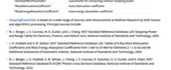 "DensityEffectParameter" a parameter for computing collision stopping power "MassAttenuationCoefficient" mass attenuation coefficient "MassEnergyAbsorptionCoefficient" mass energy‐absorption coefficient - StoppingPowerData is based on a wide range of sources, with enhancement at Wolfram Research by both human and algorithmic processing. Principal sources include: