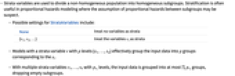 None treat no variables as strata {v1,v2,…} treat the variables vi as strata - Models with a strata variable v with p levels {s1,…,sp} effectively group the input data into p groups corresponding to the si.