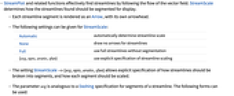 Automatic automatically determine streamline scale None draw no arrows for streamlines Full use full streamlines without segmentation {seg,npts,aratio,sfun} use explicit specification of streamline scaling - The setting StreamScale->{seg,npts,aratio,sfun} allows explicit specification of how streamlines should be broken into segments, and how each segment should be scaled.