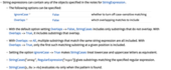 IgnoreCase False whether to turn off case-sensitive matching Overlaps False which overlapping matches to include - With the default option setting Overlaps->False, StringCases includes only substrings that do not overlap. With Overlaps->True, it includes substrings that overlap.